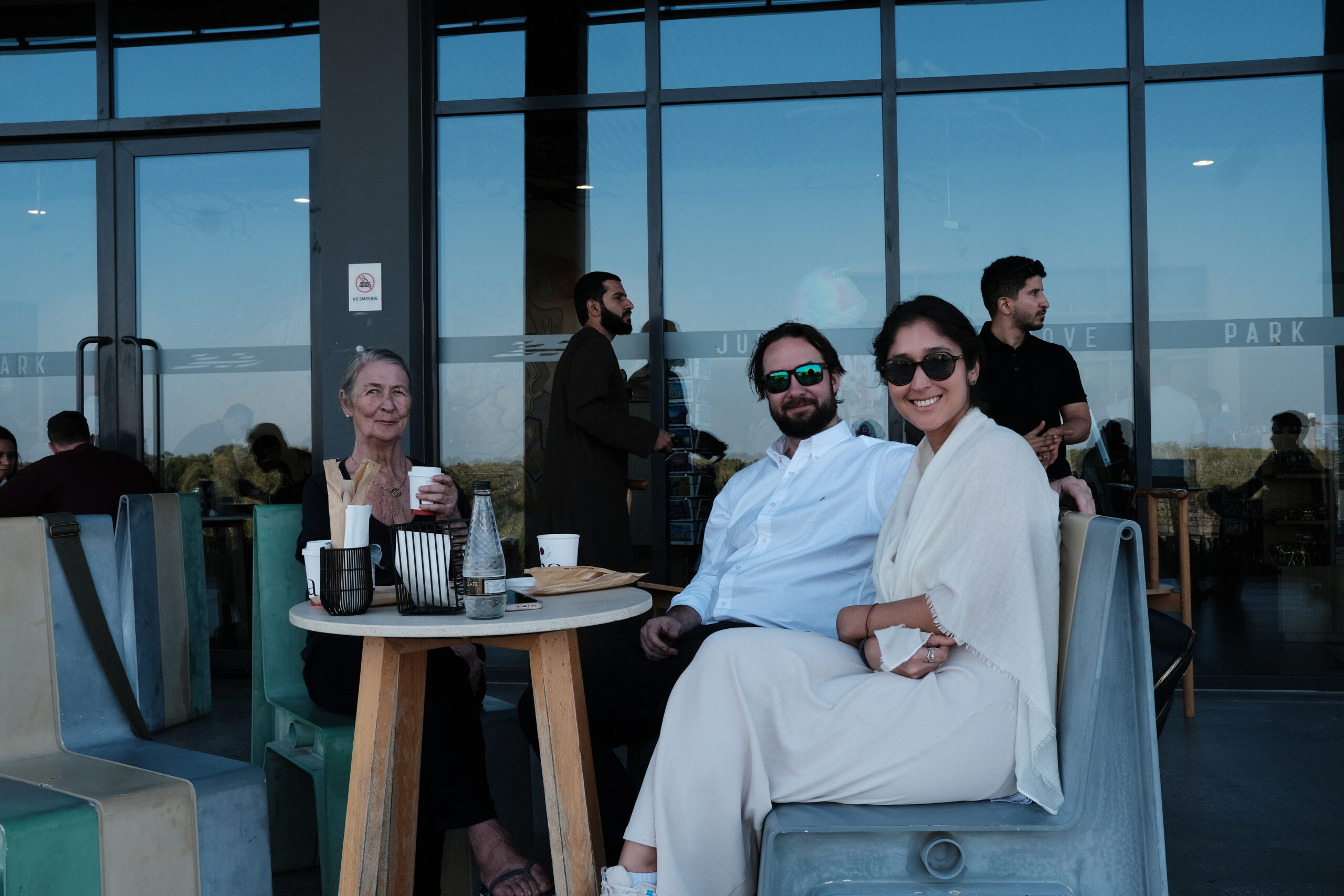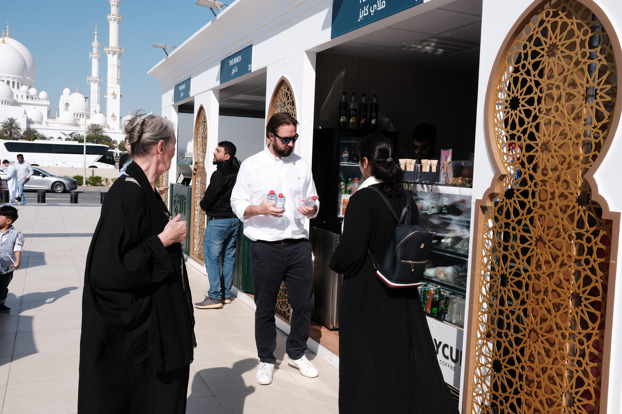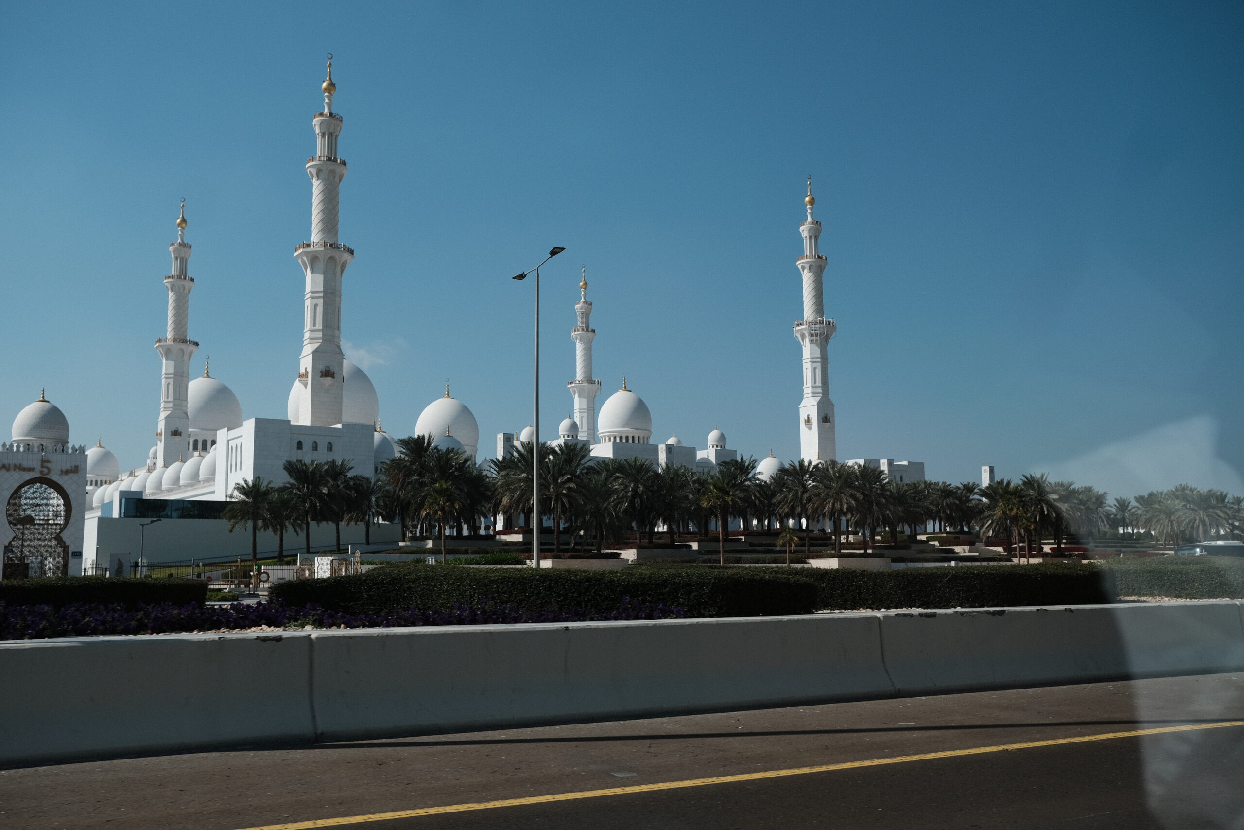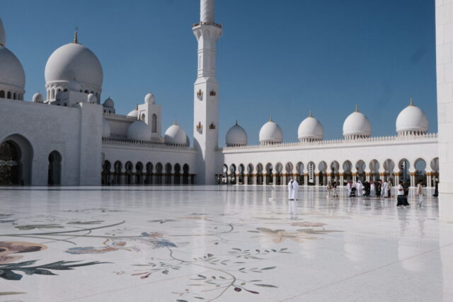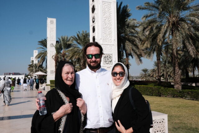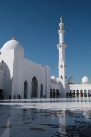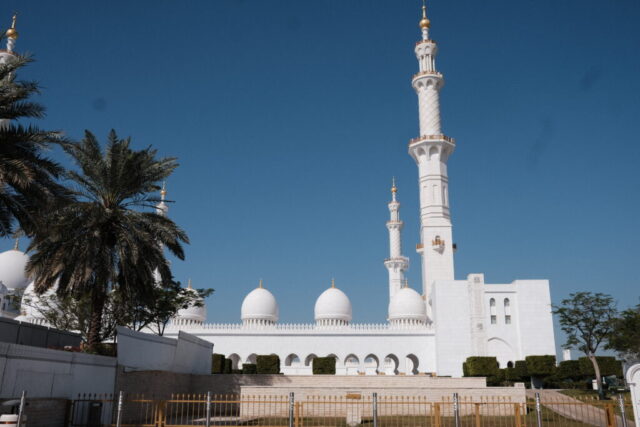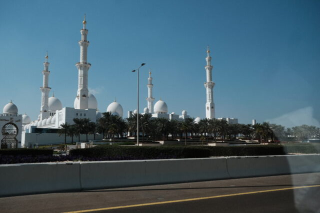 Wir fahren in das Nachbar-Emirat nach Abu Dhabi um die „Scheich-Zayid-Moschee“ zu besichtigen, die erst 2007 fertiggestellt wurde. Es ist die größte Moschee in den Vereinigten Arabischen Emiraten, auch Große Moschee genannt Eine Anzugsordnung wird vorgegeben, lange Hosen für die Herren und für die Damen eine bodenlange Kleidung, die Arme und Beine bedeckt. Ein Kopftuch ist erforderlich.