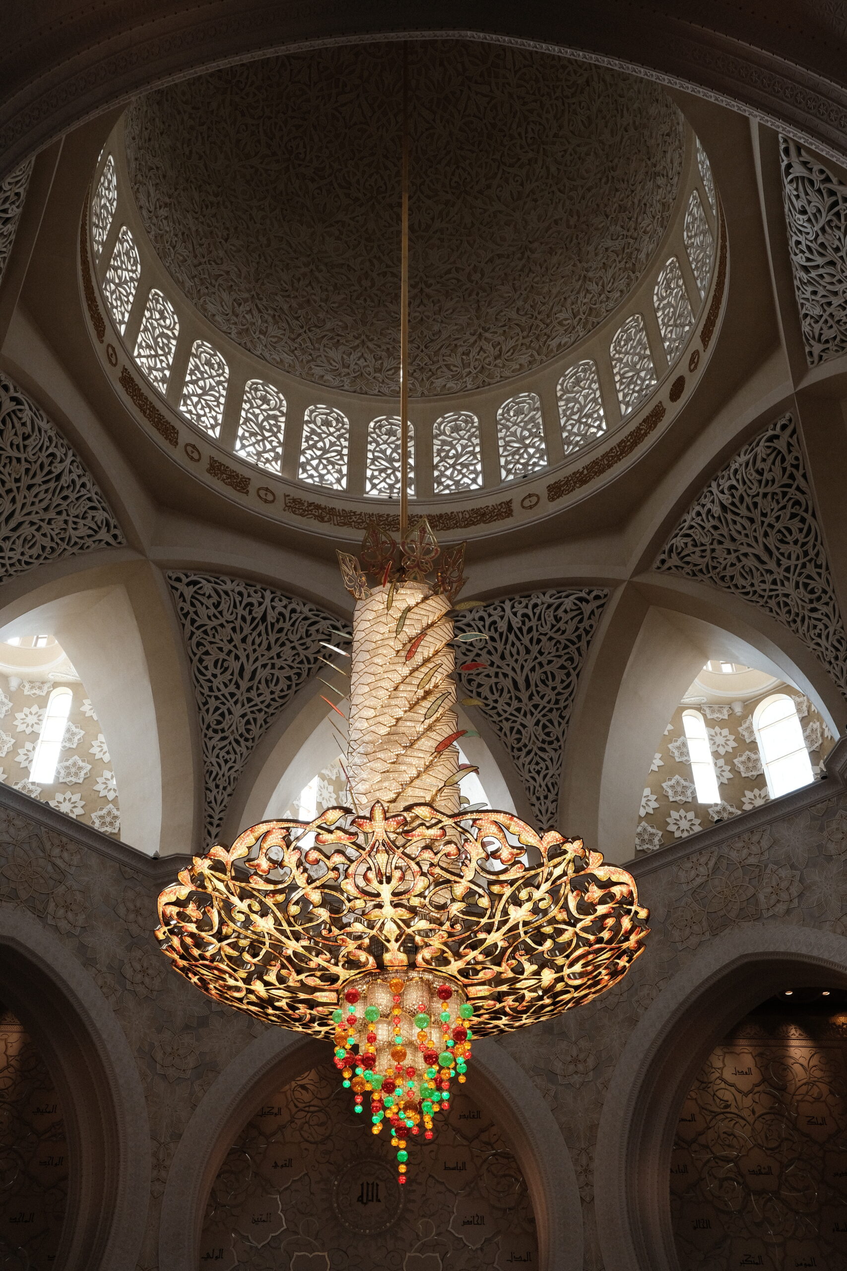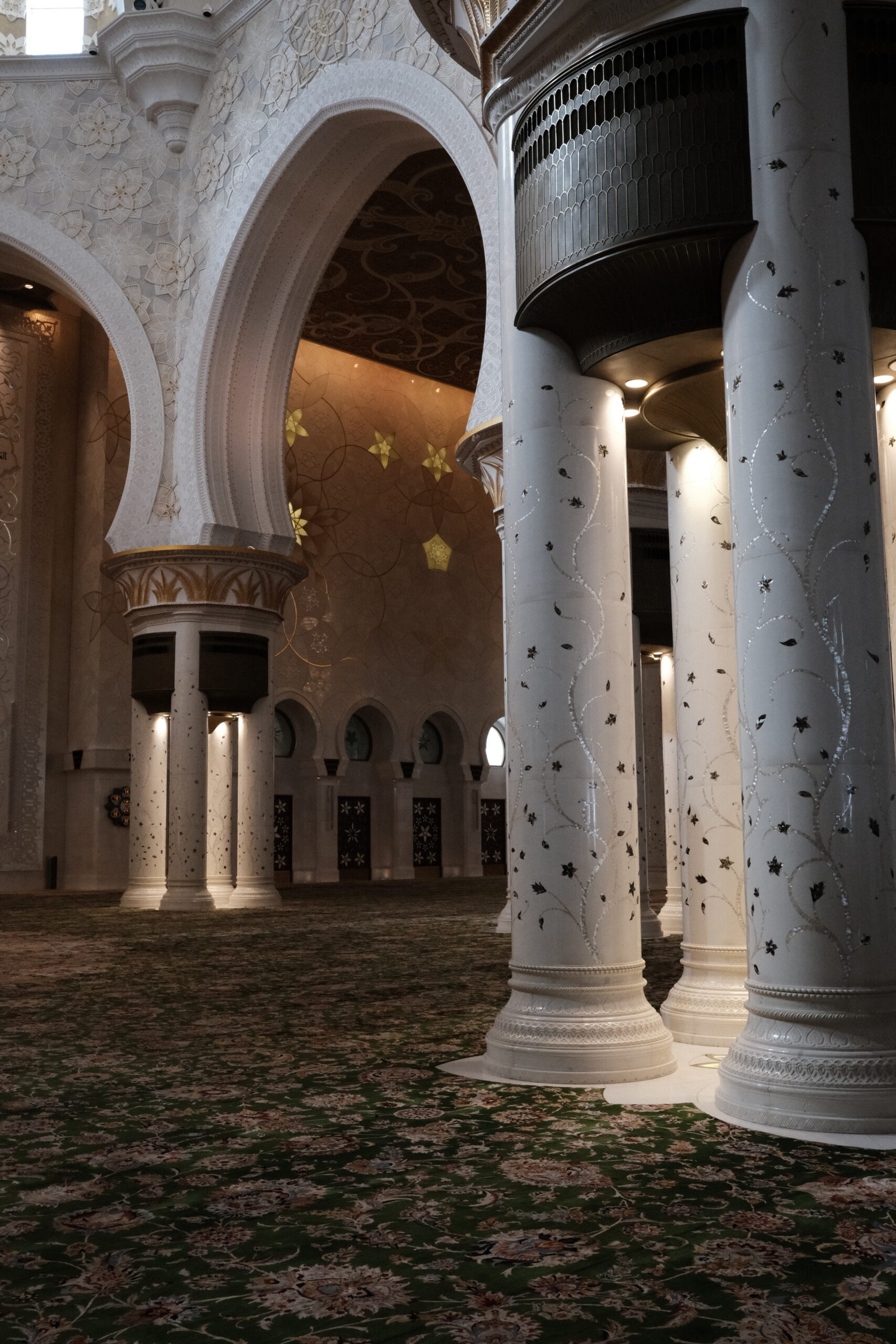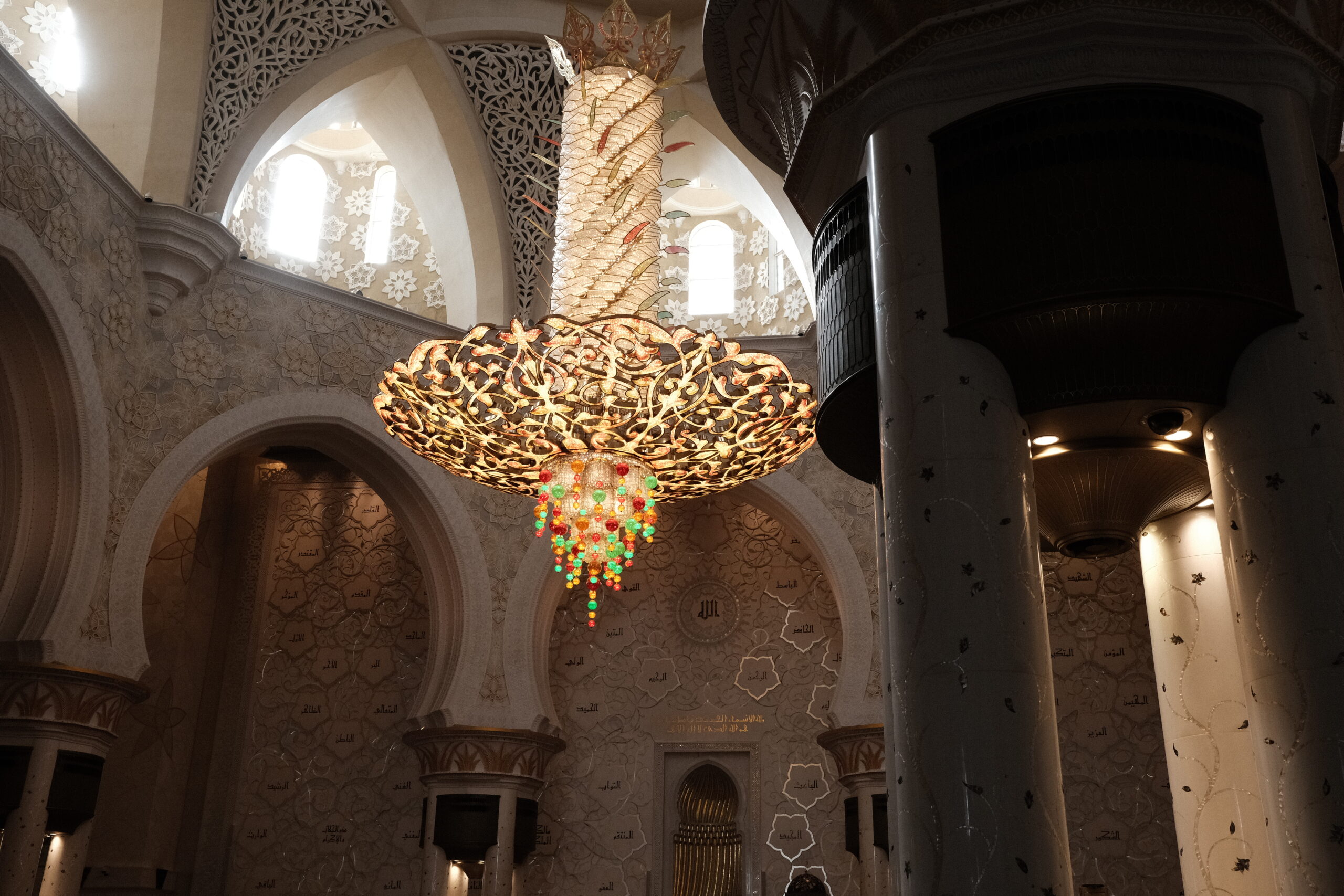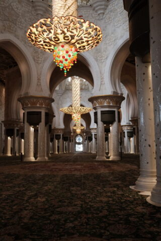 Im Innern sehen wir feinsten Marmor mit Intarsien und ein Riesenteppich (er soll 5627qm groß sein) sowie wuchtige sieben Kronleuchter im großen Gebetsraum. Der größte Kronleuchter hat einen Durchmesser von 10 Metern und eine Höhe von 15 Metern und gilt als der größte der Welt.