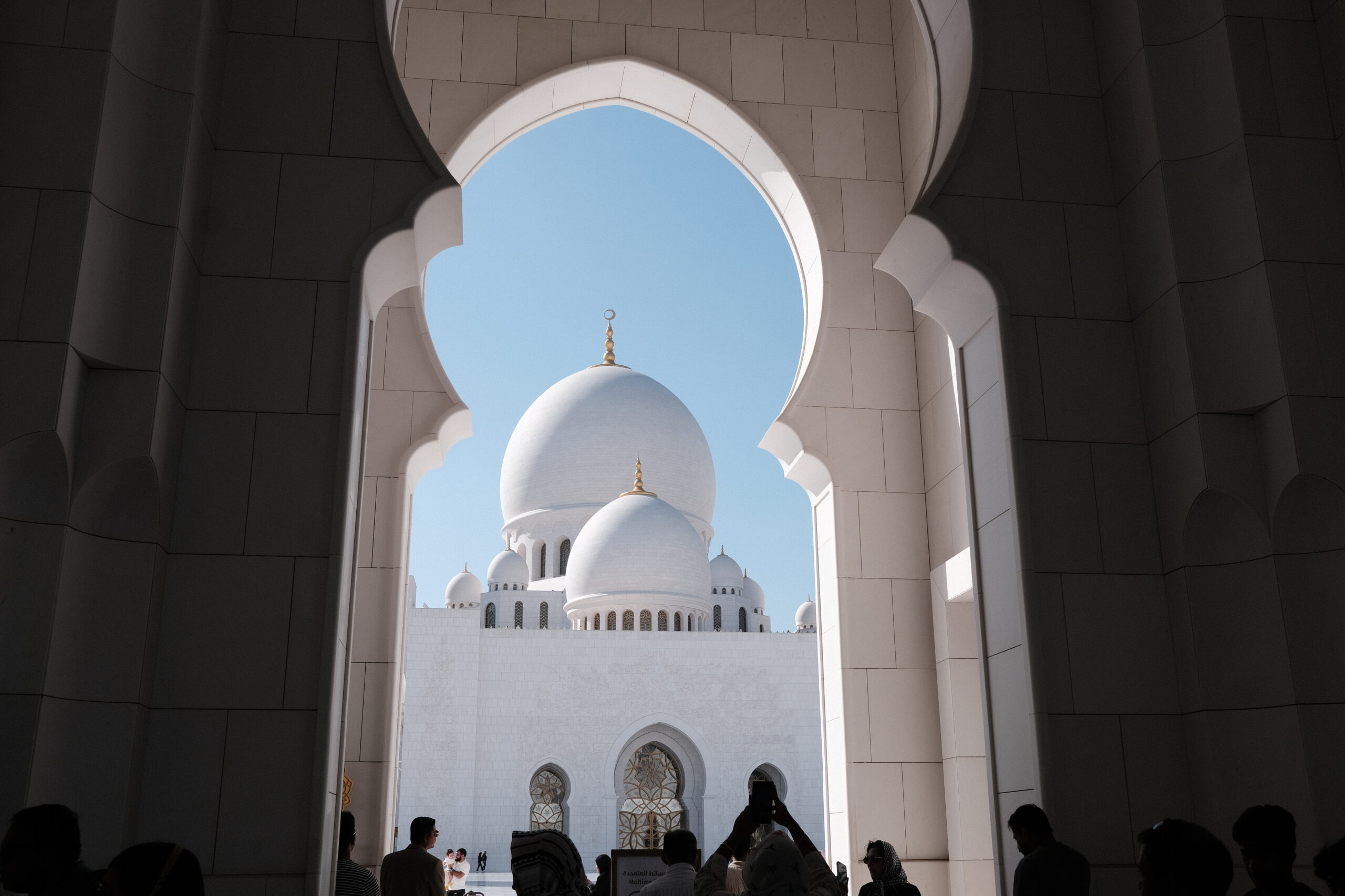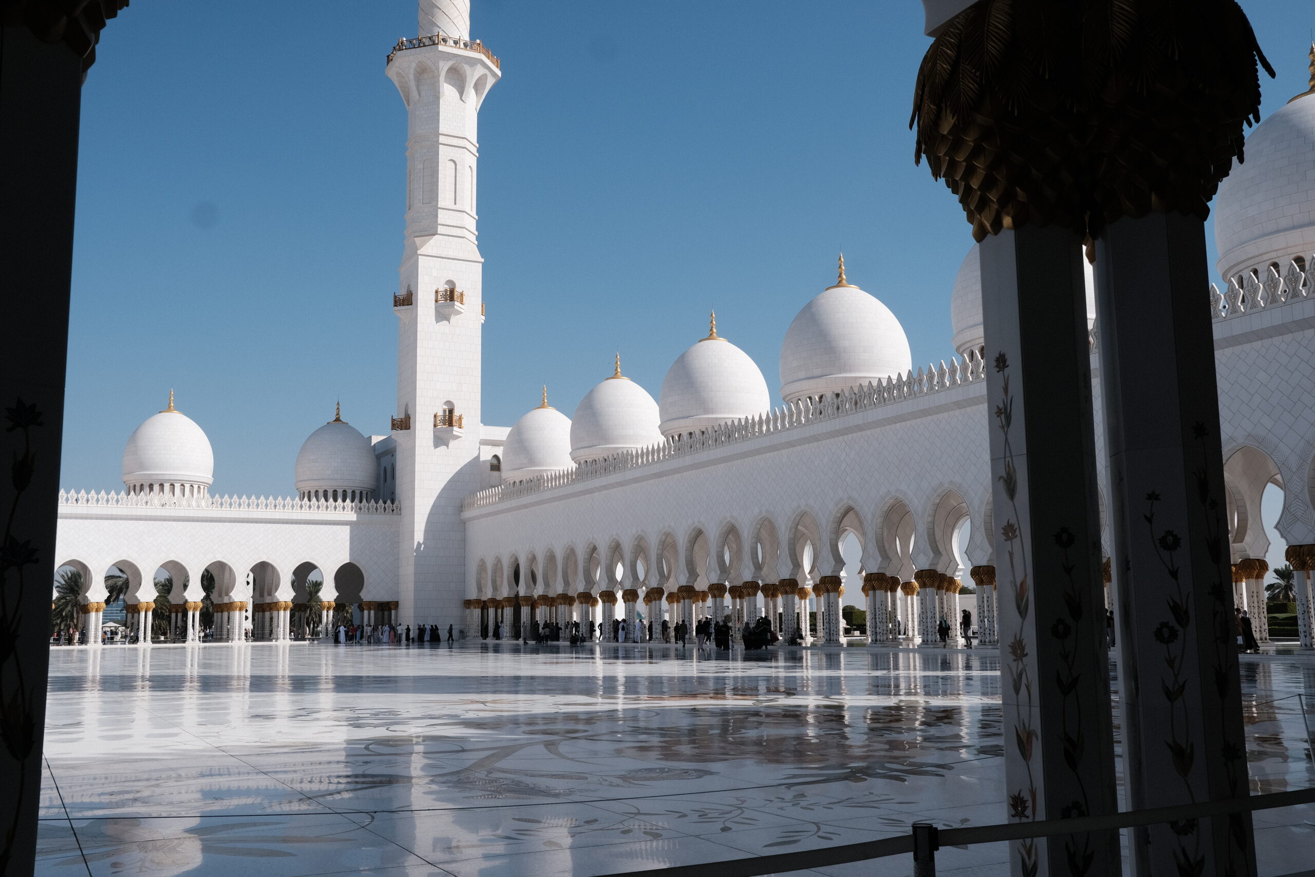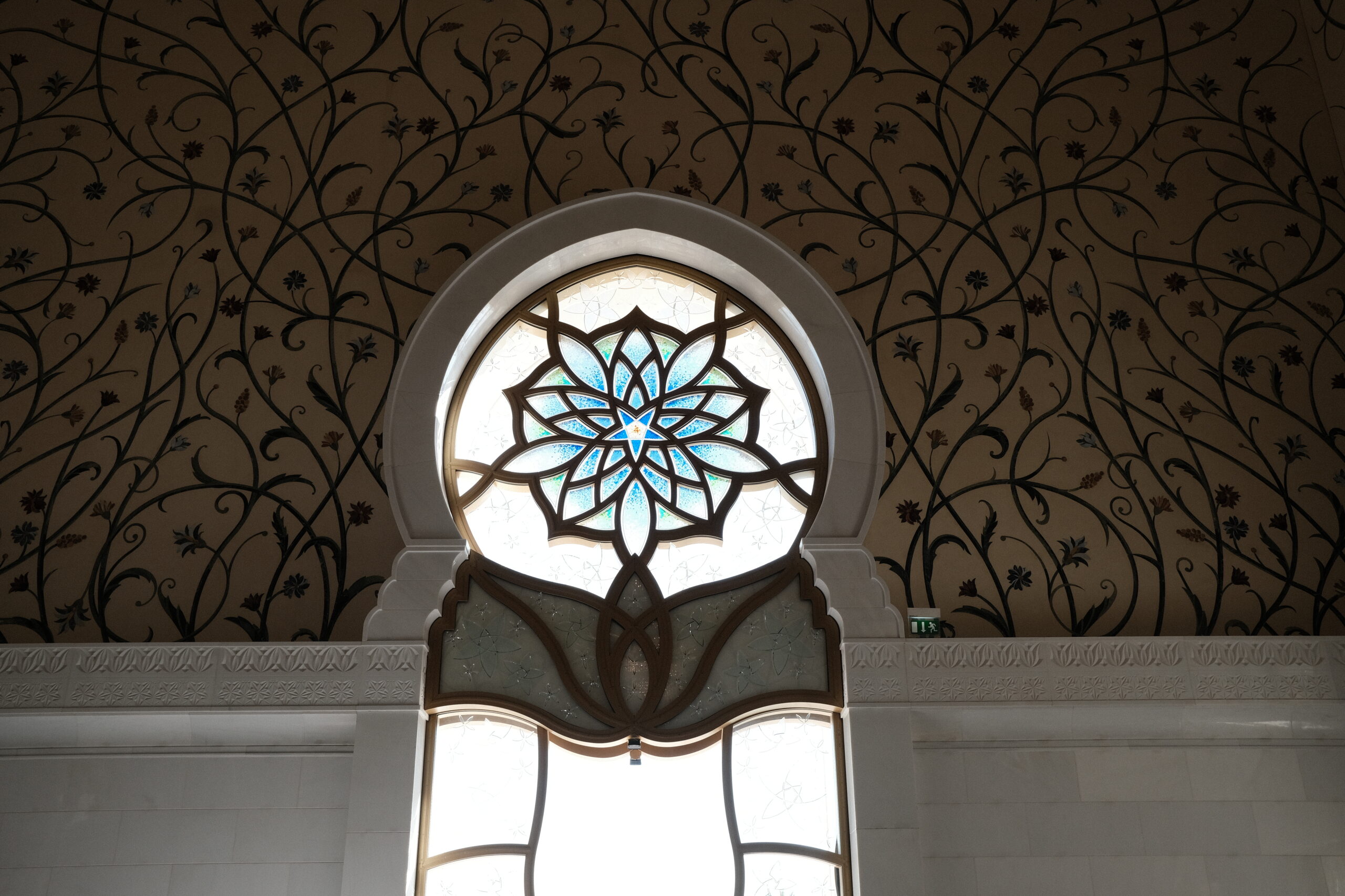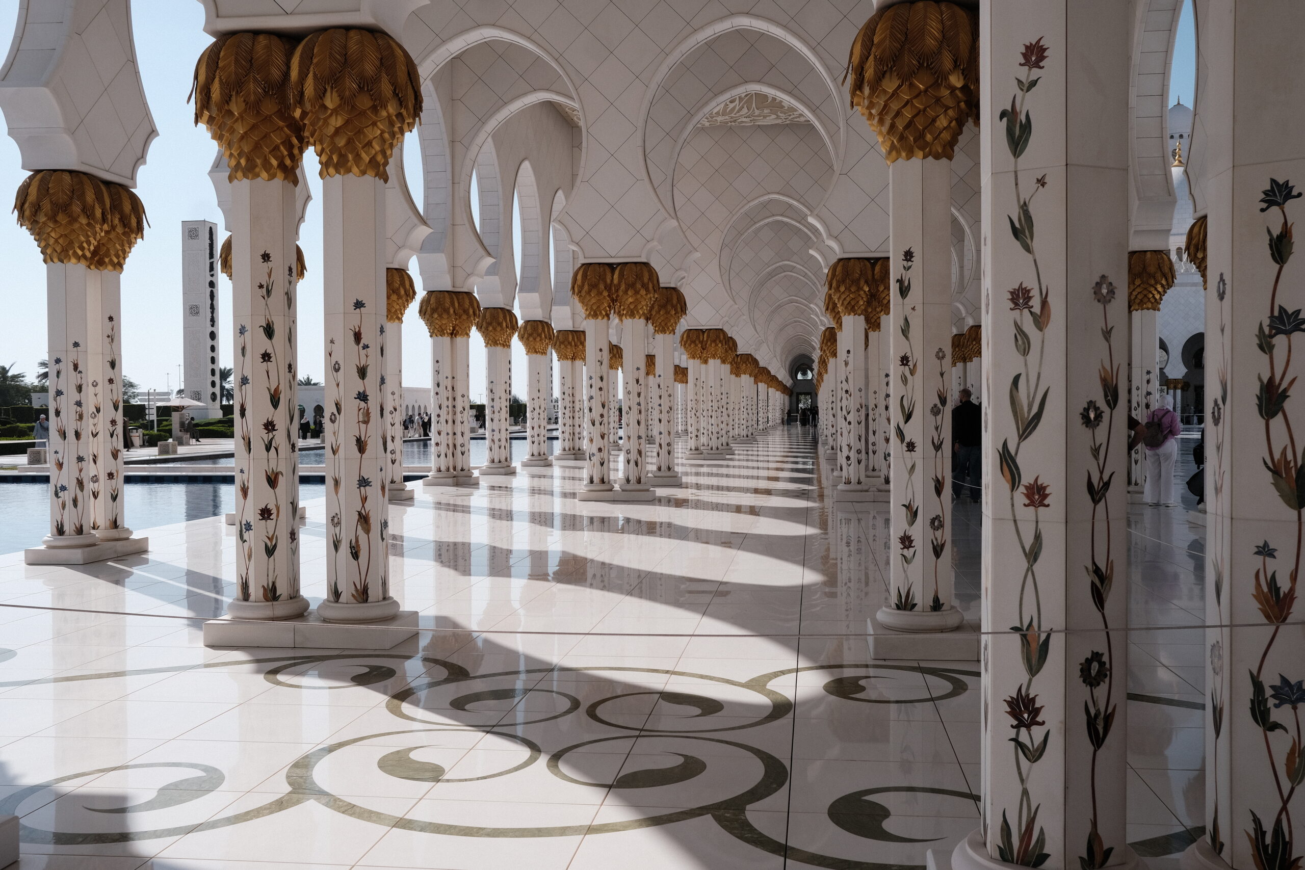 Im Innern sehen wir feinsten Marmor mit Intarsien und ein Riesenteppich (er soll 5627qm groß sein) sowie wuchtige sieben Kronleuchter im großen Gebetsraum. Der größte Kronleuchter hat einen Durchmesser von 10 Metern und eine Höhe von 15 Metern und gilt als der größte der Welt.